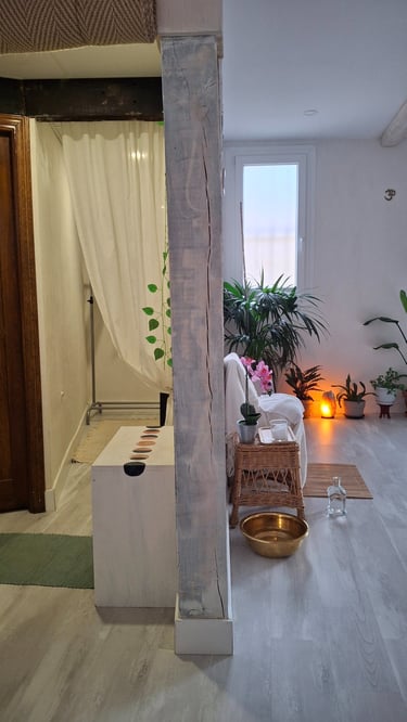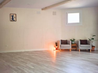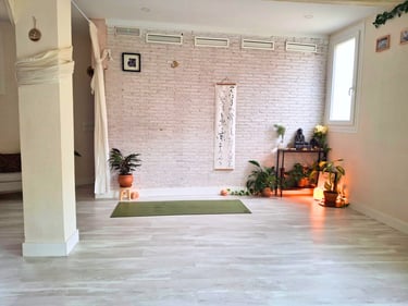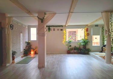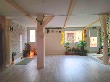 La sala de práctica consta de 66 m2 útiles, prácticamente diáfanos, salvo una columna. Con tarima clara y paredes en crudo, un bálsamo de serenidad. Tiene un gran ventanal que aporta mucha luz, especialmente por la mañana, cuando entran los rayos del sol hasta el centro de la sala durante el invierno.